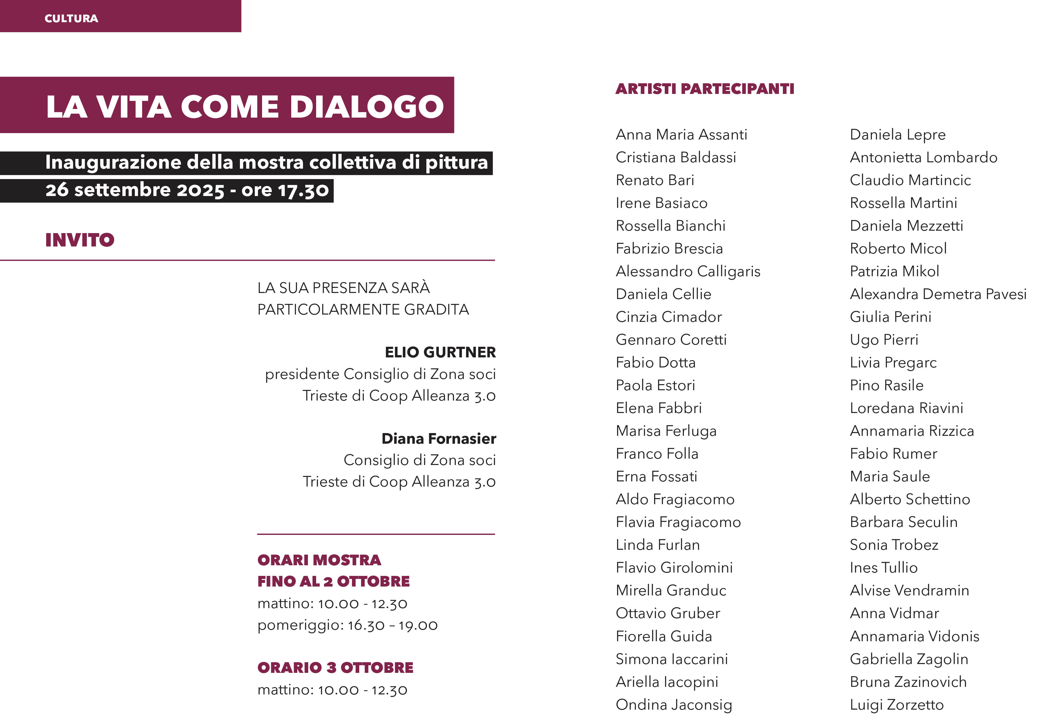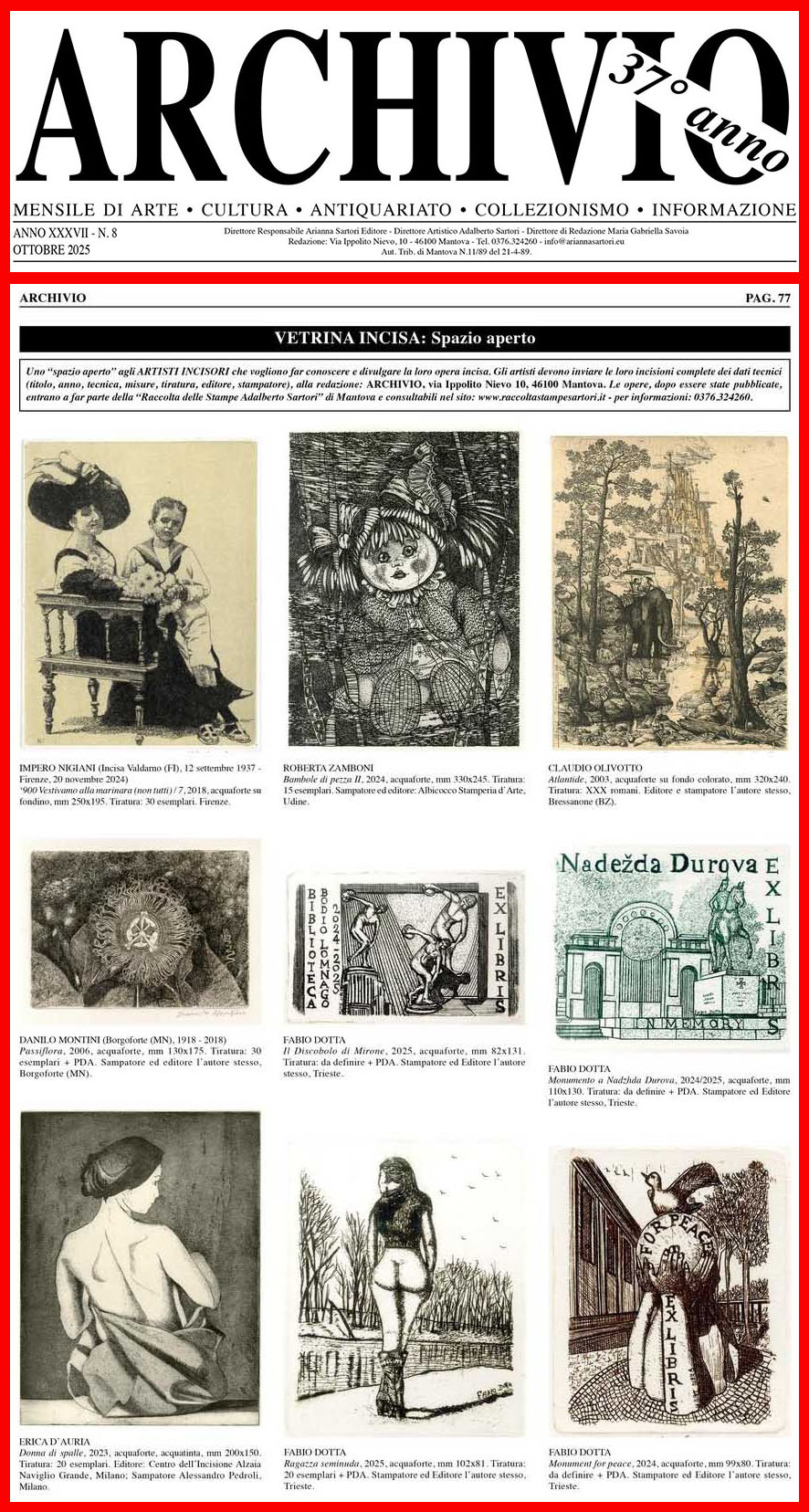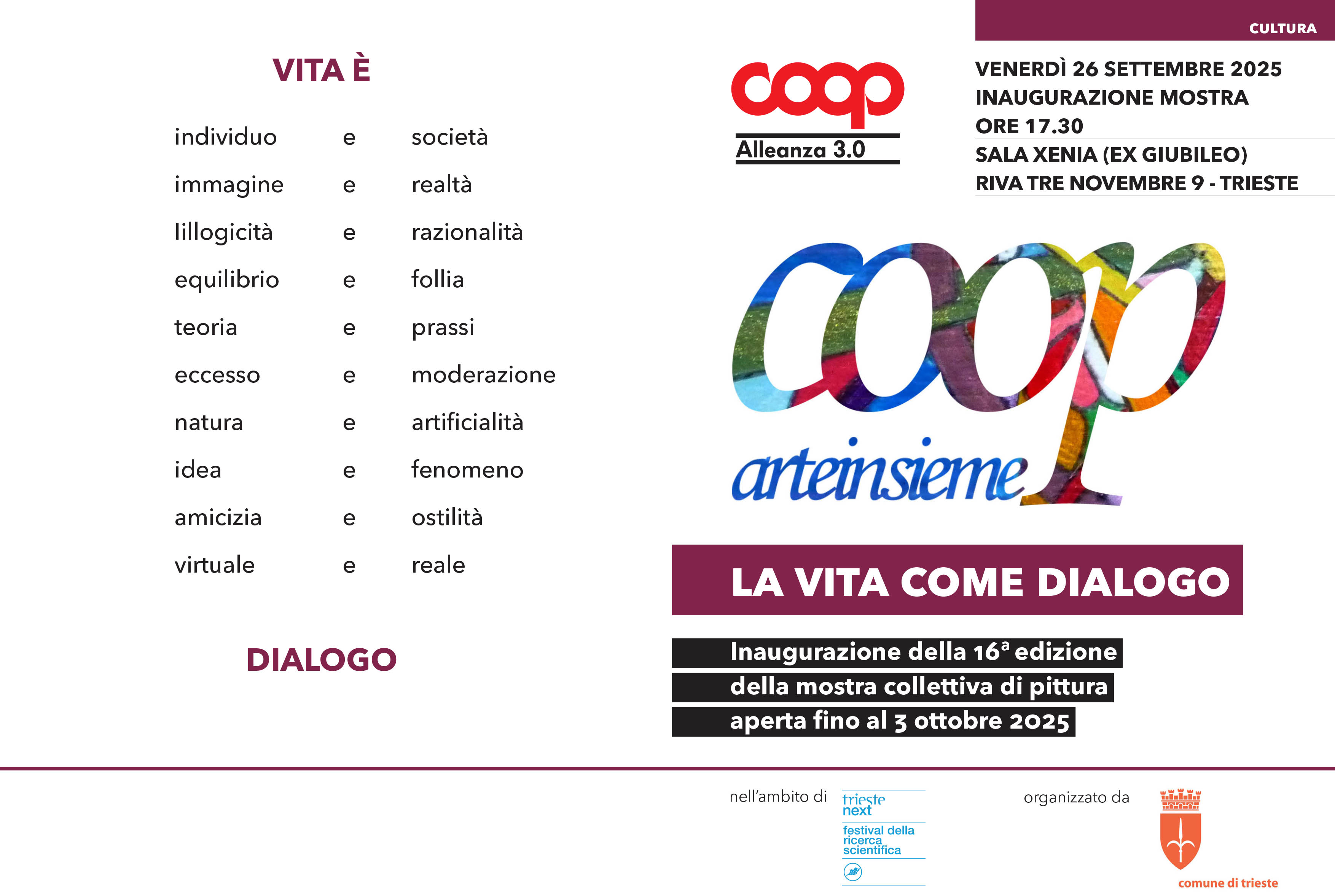 Dal 26/09/25 al 03/03/25 nella Sala Xenia (Ex sala del Giubileo) Via Riva Tre Novembre n°9 (180 m da Piazza Unità di Italia) 16ª edizione della mostra collettiva di pittura “La vita come dialogo”, che trae ispirazione dal tema della manifestazione NEXT, in programma a Trieste negli stessi giorni. La mostra aperta fino al 3 ottobre 2025 con orari: 10.00–12.30 e 16.30–19.00 – 3 ottobre solo mattino 10.00–12.30. Gli artisti presenti (tutti operanti a Trieste e nei comuni limitrofi) sono ben n°52 e le opere in mostra un centinaio su due sale attigue (Fabio Dotta presente con 2 opere dell’estate 2025 su cornici 100 cm x 80 cm inerenti REGGIO CALABRIA). Ingresso libero. Nel numero di Ottobre 2025 del mensile di arte “Archivio” di Mantova sono state inoltre pubblicate n°4 opere del 2024 e 2025 di fabio Dotta (vedi ultima foto sotto).